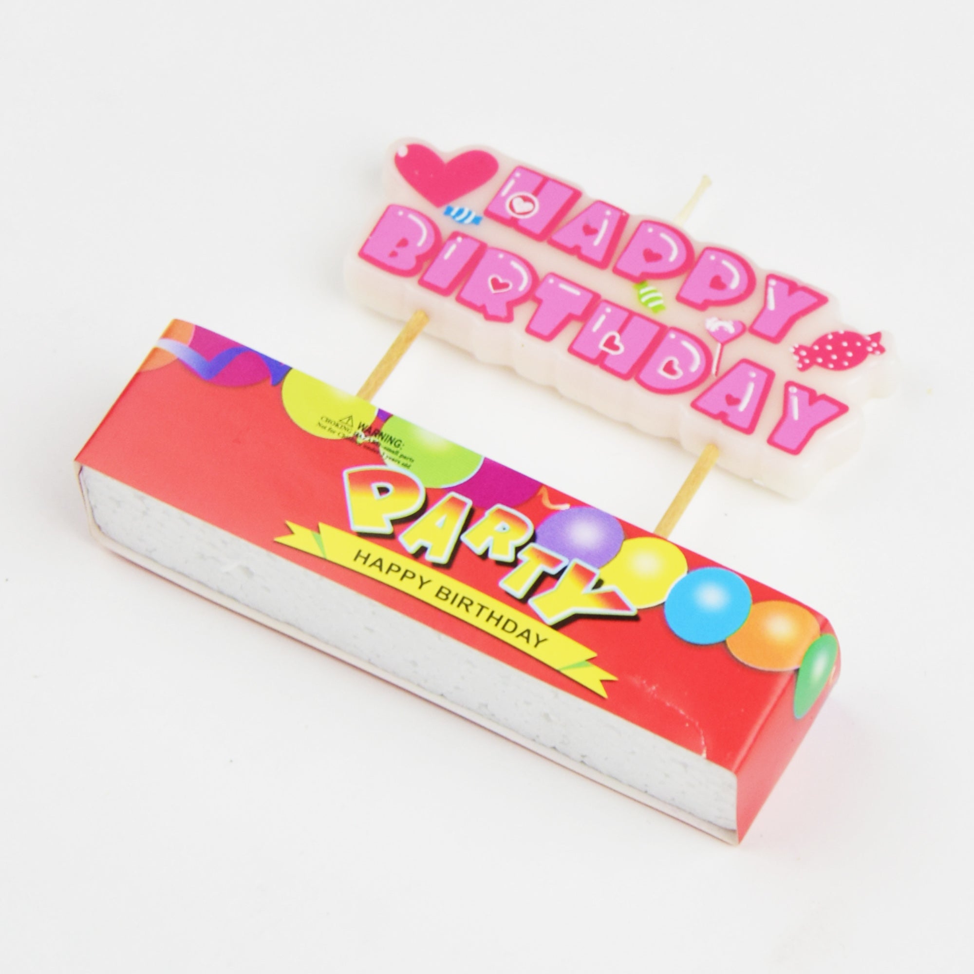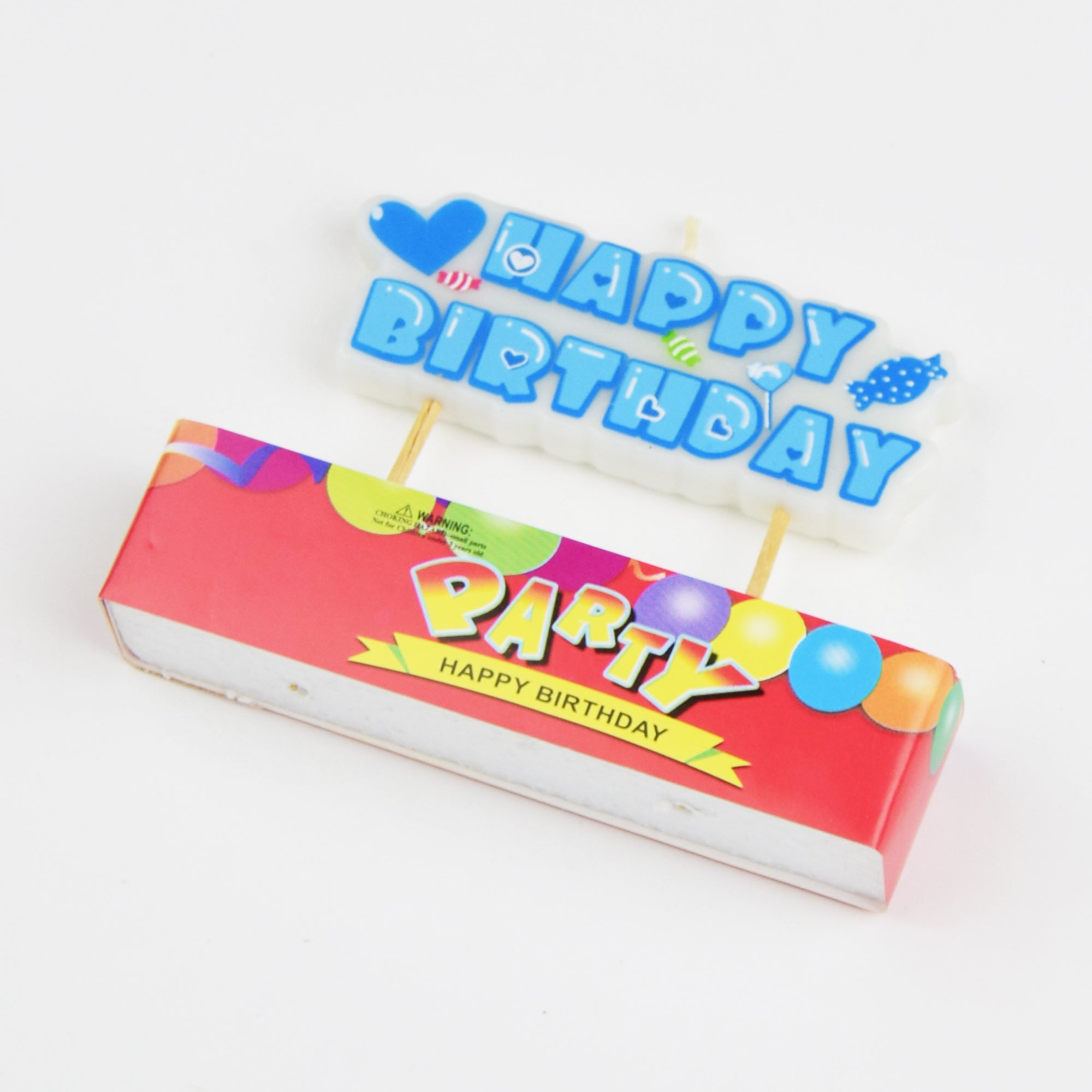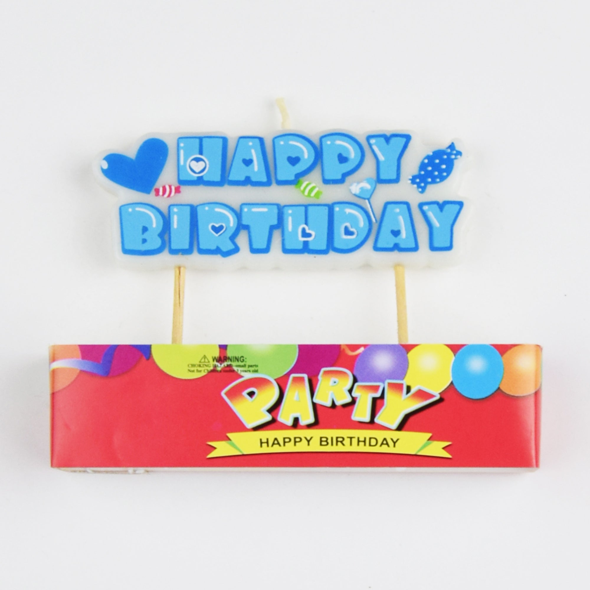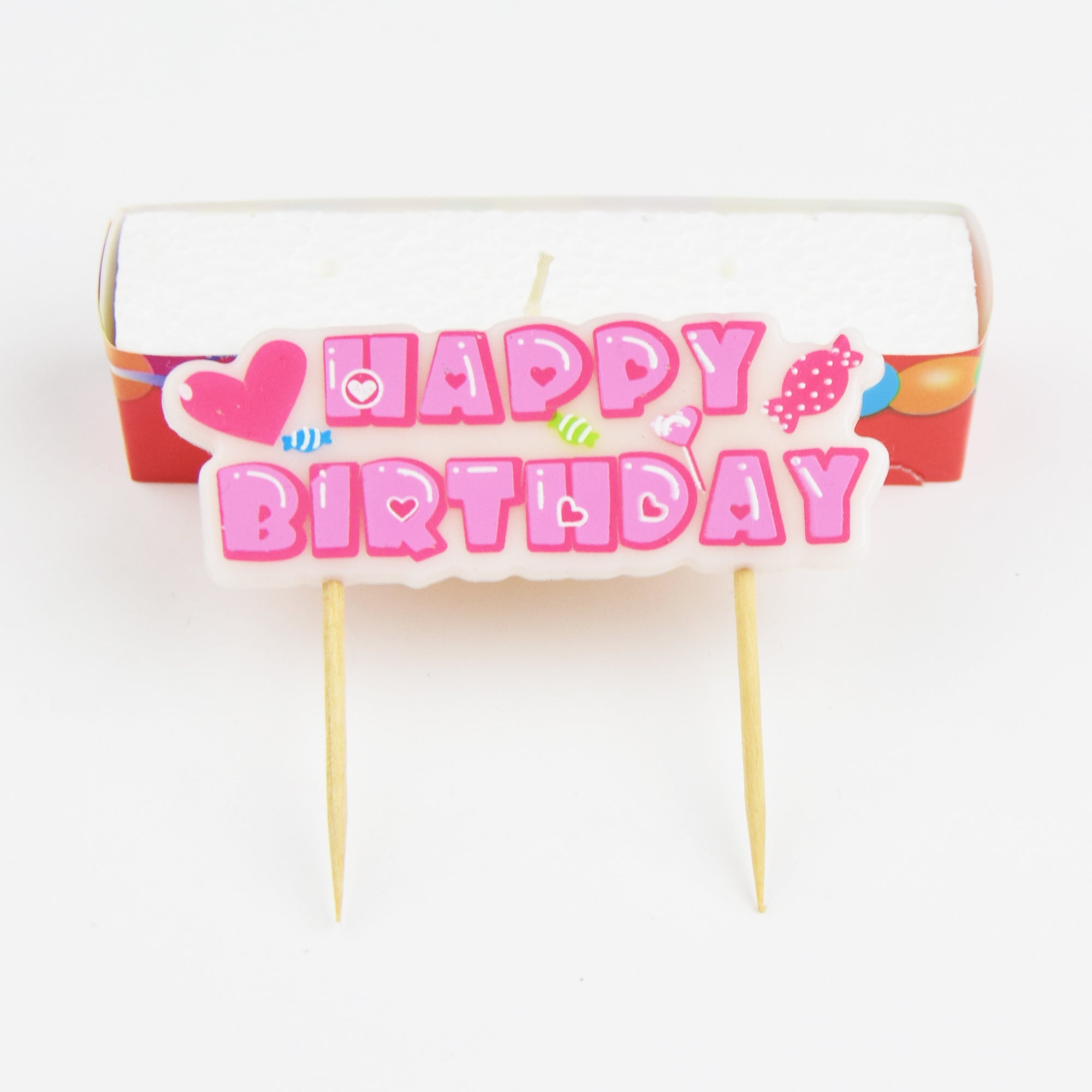 A sweeet toothpick candle saying Happy Birthday available in blue or pink.